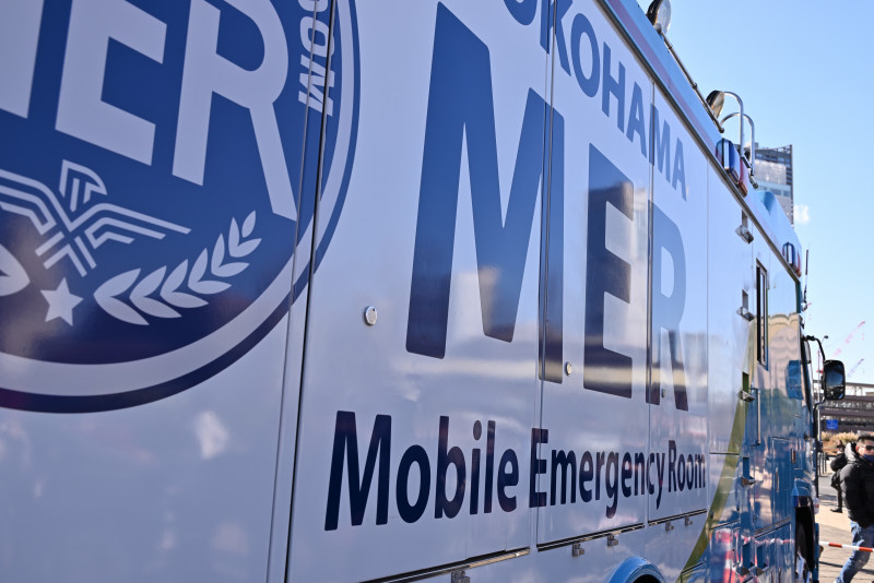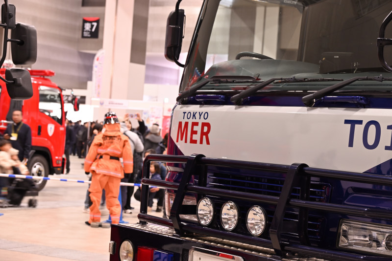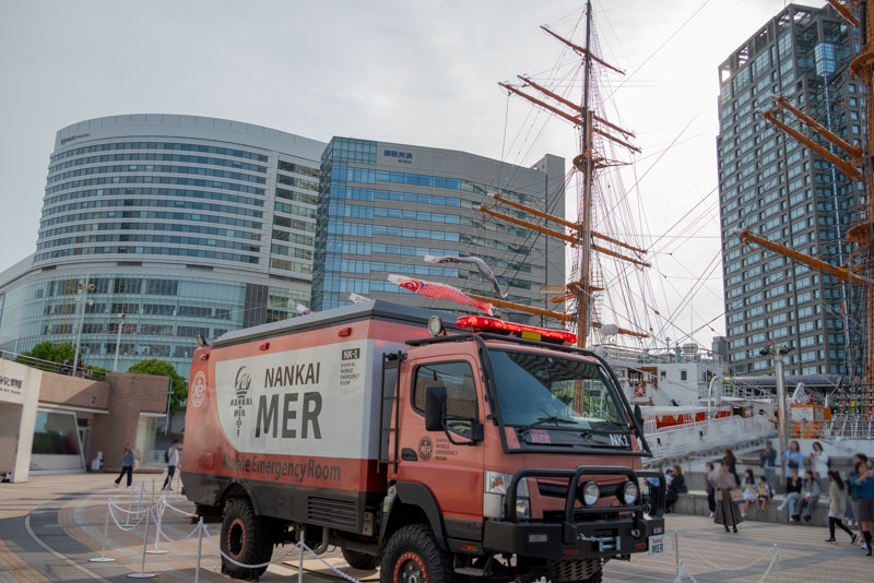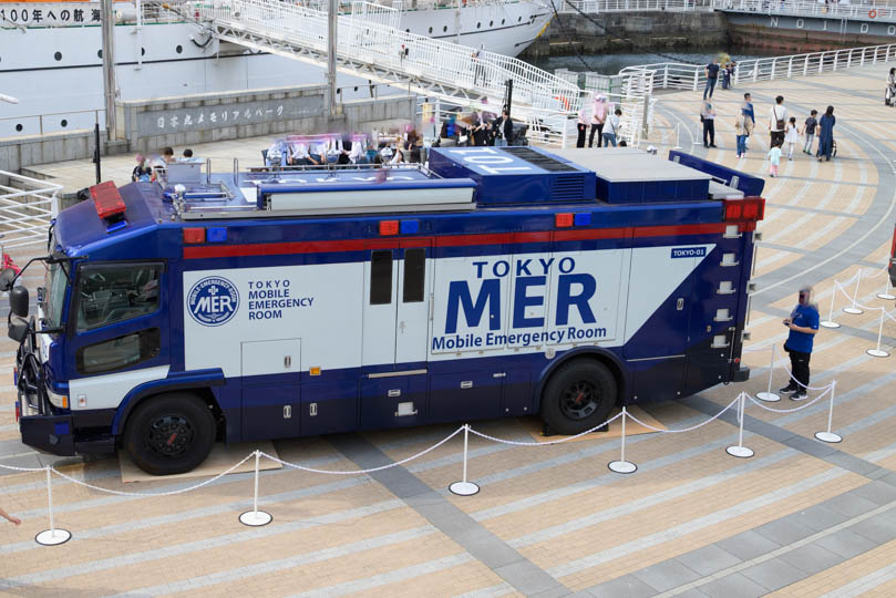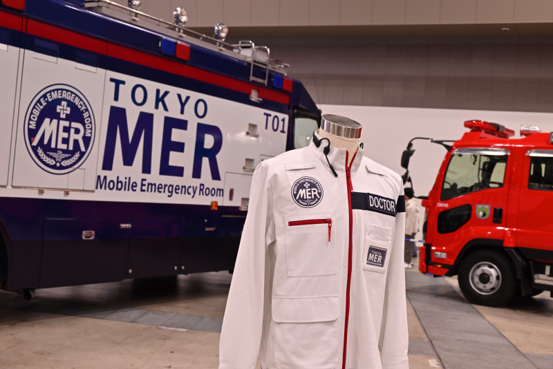 赤と白のカラーリングと、どっしりとした重厚感のある車体が特徴。「TOKYO MER」の巨大なロゴを見ると、あのテーマ音楽が自然と頭の中で鳴り響いてきますよね(^^♪