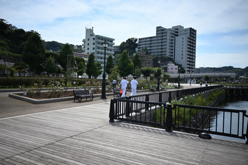 ヴェルニー公園が艦船ウォッチングに最適である最大の理由は、驚異的な近さにあります。目の前がすぐに海上自衛隊とアメリカ海軍の基地になっており、係留されている艦船や潜水艦を、視界を遮るものなく眺めることができるからです。